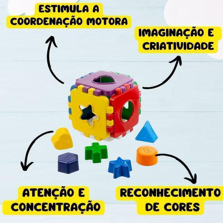 Cada lado do cubo apresenta diferentes desafios e atividades educativas. As peças são coloridas e vibrantes, estimulando o reconhecimento e a associação de cores desde cedo. Além disso, as formas geométricas variadas proporcionam às crianças a oportunidade de explorar diferentes figuras e desenvolver habilidades espaciais.